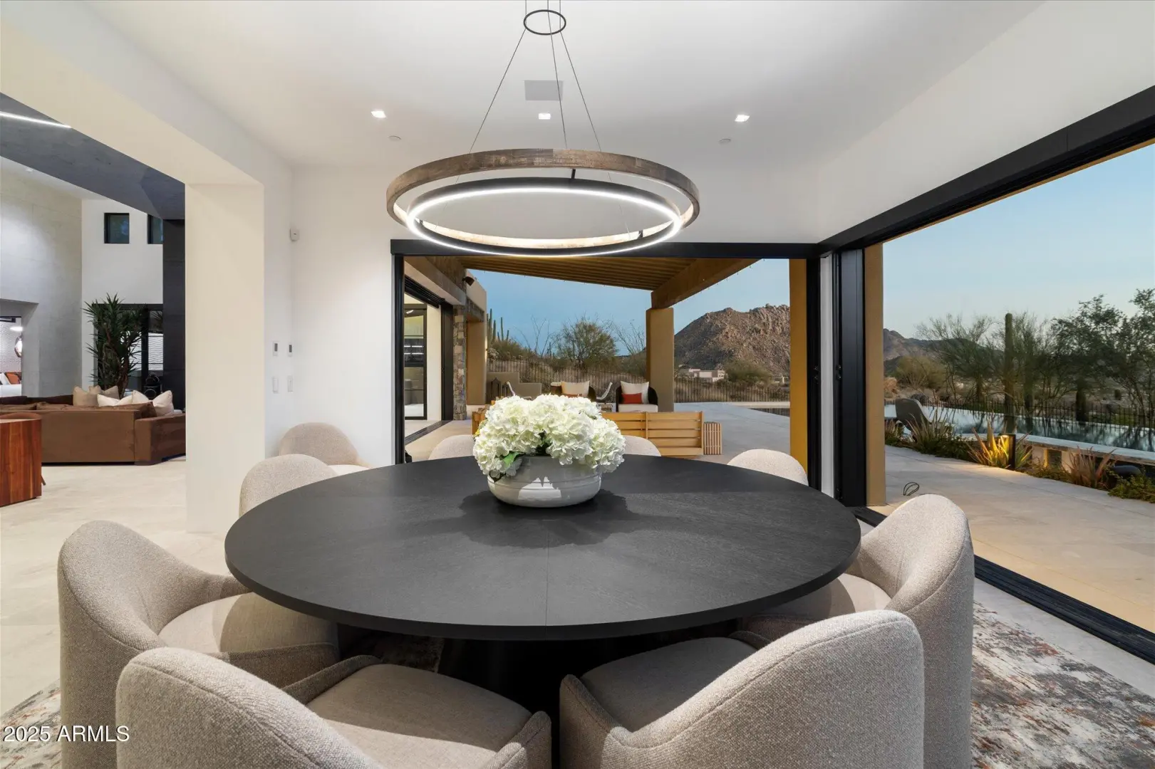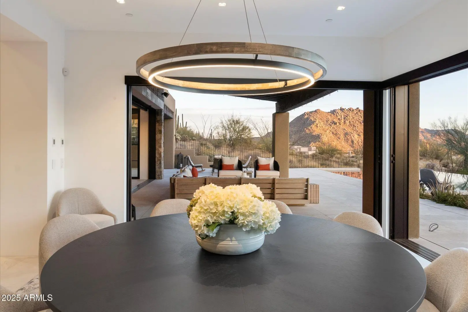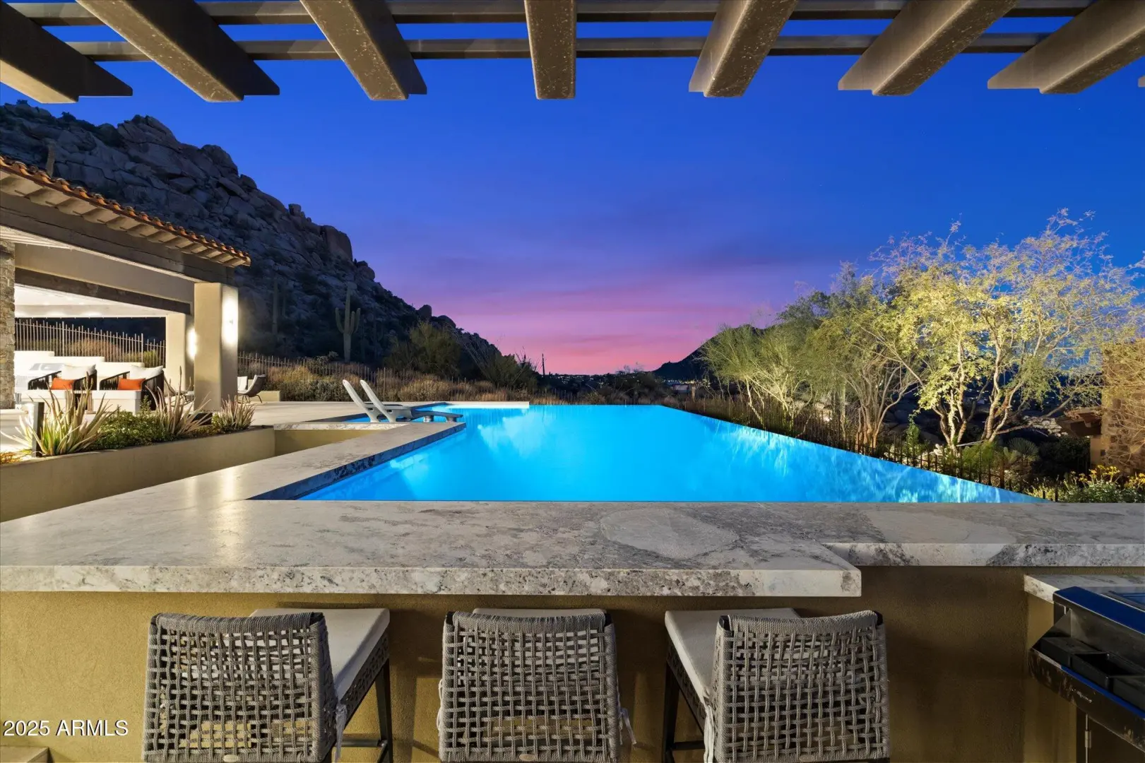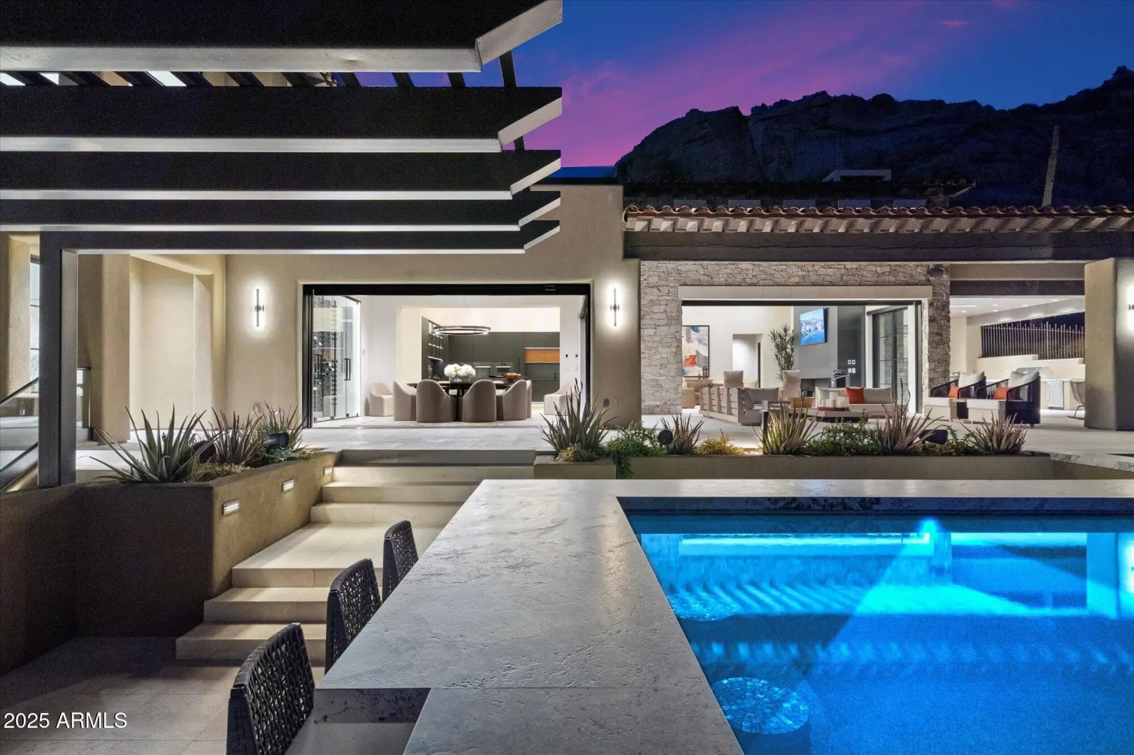 7 min walk to Four Seasons Resort lobby; 1 of 11 custom homesites offering lifestyle amenities to Privada; North Scottsdale gated community on resort grounds, capturing panoramic views of Pinnacle Peak, Troon, McDowell Mountains, city lights, and golf course views. All on one-level living designed by: POETZL architecture, offering a bonus room/office plus a spacious view deck on the second level. European in style with Highest level of construction and building materials; the sliders, fireplaces, Linear cabinetry, Neolith stone countertops, sandblasted marble tiles, wide plank oak flooring, textured walnut millwork, Miele appliances, wine wall, show and prep kitchens are all the very best available. The primary suite and 3 additional ensuite bedrooms each have their own wet bars...