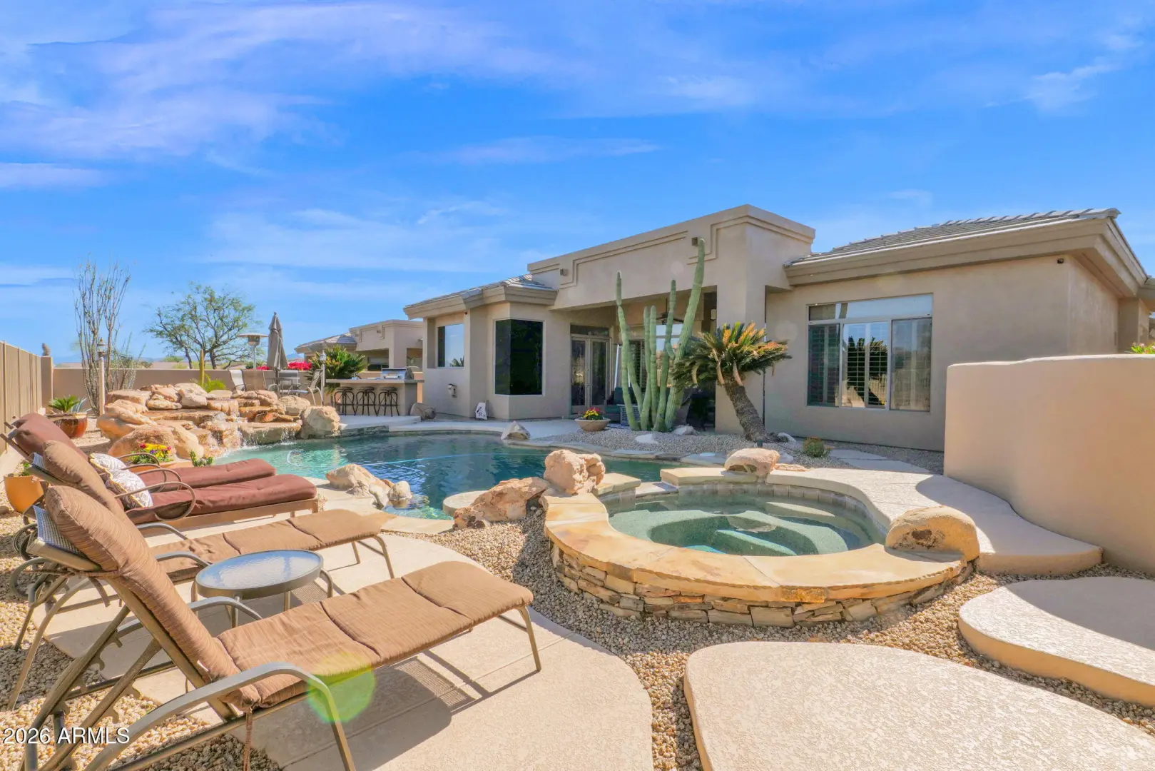 Executive golf course home in Sunridge Canyon overlooking the 9th fairway with breathtaking views of Four Peaks, the McDowell Mountains & Red Rock. This model-perfect residence is loaded with upgrades including slab granite counters, maple cabinetry, crown molding, leaded-glass French doors and butted-glass windows that frame the incredible desert and golf course views. Spacious floorplan includes attached guest quarters and designer finishes throughout. The resort-style backyard is an entertainer's dream featuring lush landscaping, heated saltwater pool, spa, water feature and built-in BBQ island with sink. A rare opportunity to own a beautifully upgraded golf course property in one of Fountain Hills' most desirable communities.