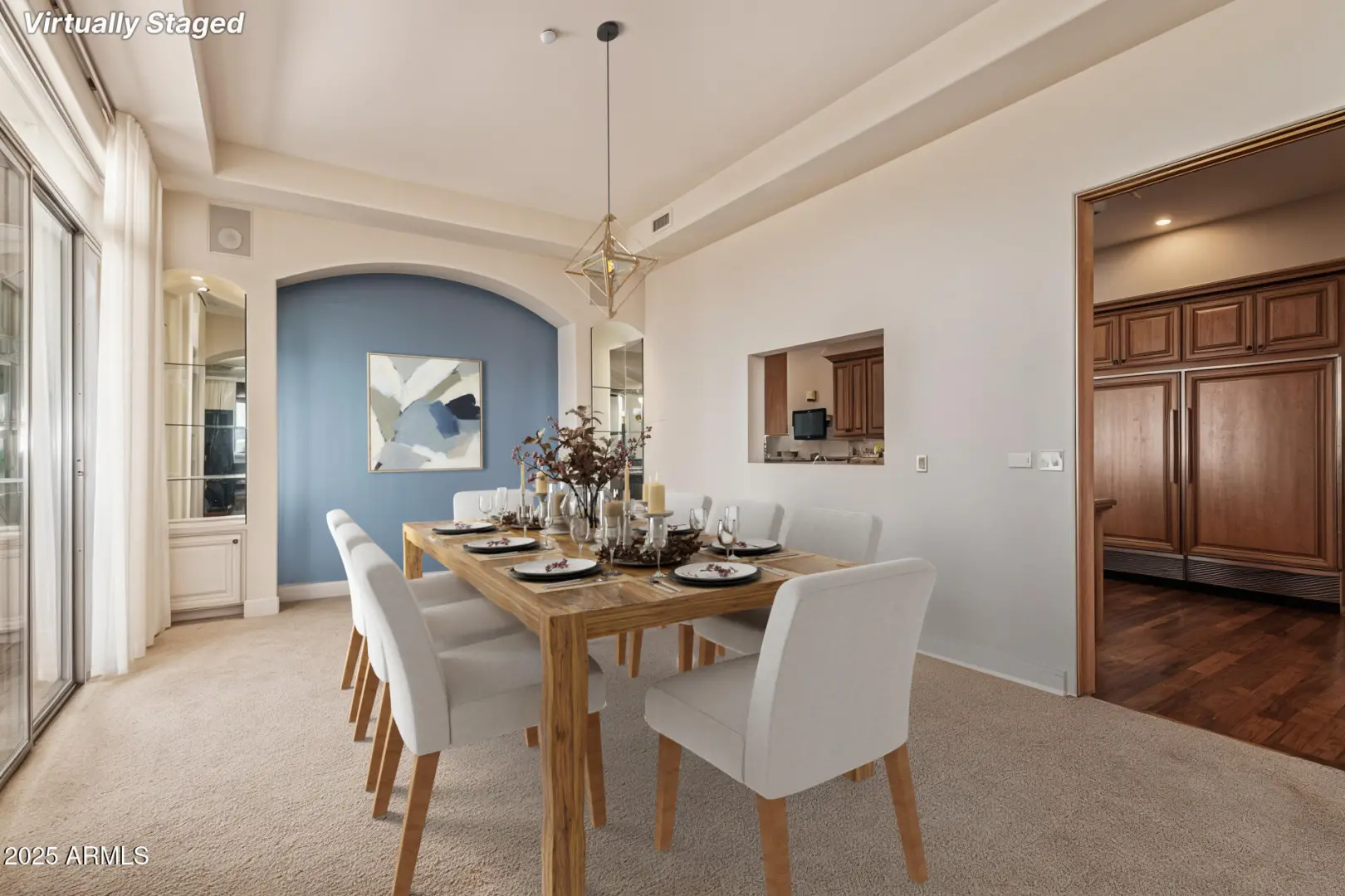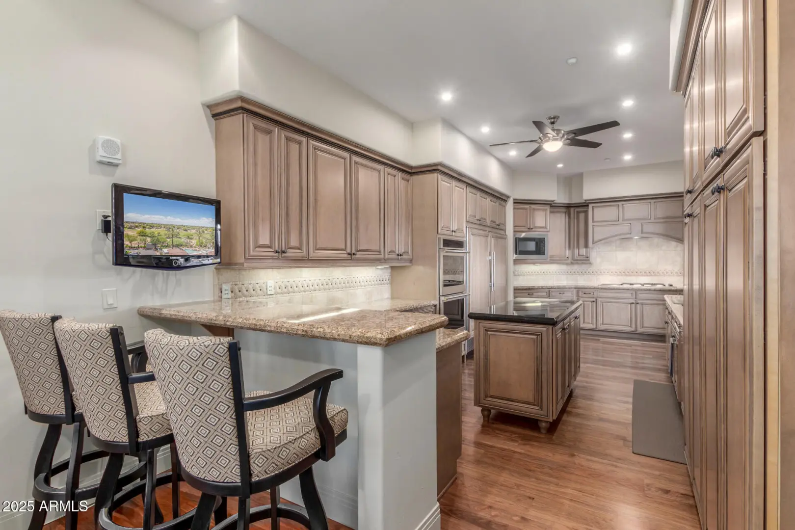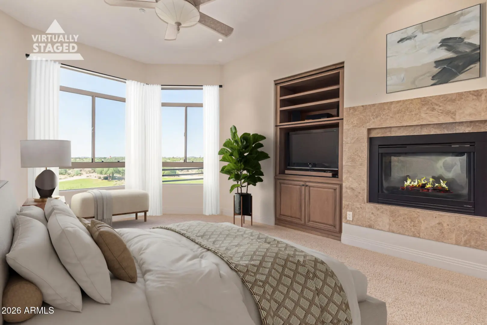 Best value in Kierland for a RARE end-Cap Penthouse with VIEWS! Unmatched views of the Westin Kierland Golf Course and surrounding mountains from this luxurious 3BR/3BA residence with 11' ceilings, 3 private patios, and views to the north, west & east. Elevator access, 2 fireplaces, surround sound, and an expansive open layout make this home truly one-of-a-kind. Chef's kitchen features a 6-burner gas range, double ovens, built-in appliances, and wine fridge. The spacious primary suite offers a fireplace, sitting room, 2 walk-in closets, and spa-style bath. Guest suite with full ensuite + two large offices with built-ins (one can be used as a 3rd bedroom or flex space). Includes 3 parking spaces & 2 storage units (additional storage available for purchase).