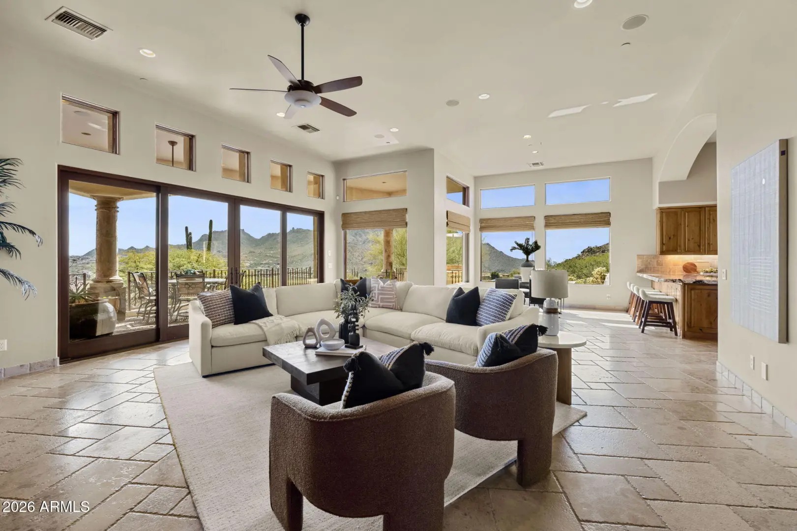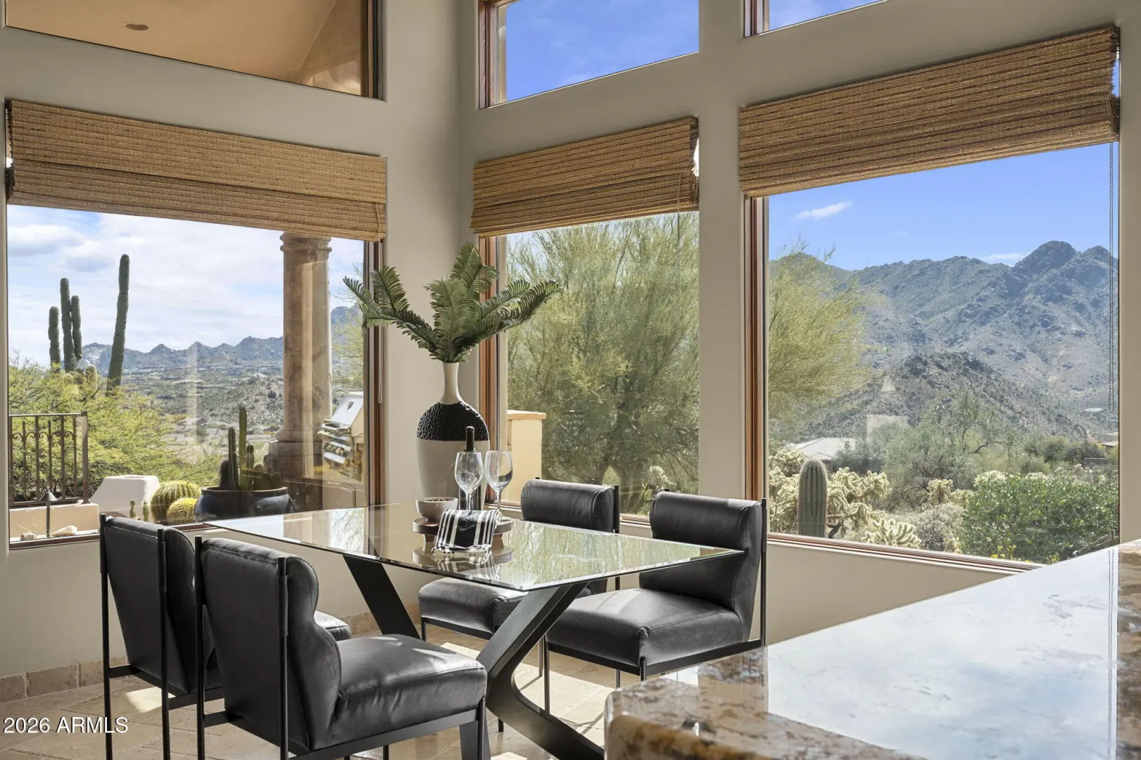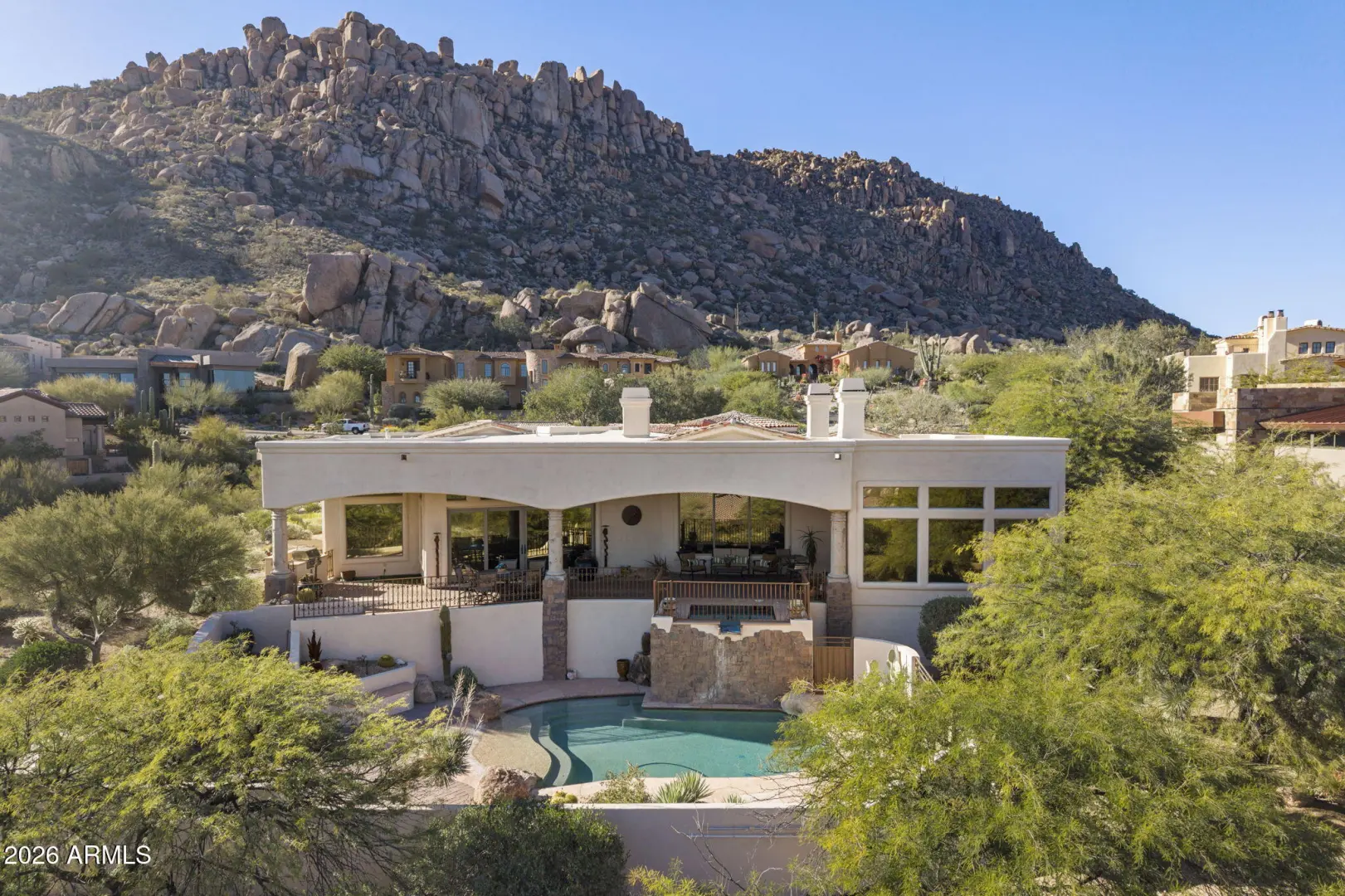 Experience refined desert living in this beautifully designed Troon Village residence, where timeless materials, thoughtful design, and breathtaking mountain views create an exceptional retreat. With no interior steps, the home offers effortless single-level living, rich wood flooring & travertine bring warm elegance throughout. Five stunning gas fireplaces anchor the home's primary gathering spaces, including the living room, family room, primary suite, front courtyard & pool deck, creating inviting moments indoors and out. The chef's kitchen anchors the heart of the home, & is equipped with Bosch stainless steel appliances, a double oven, gas range & built-in refrigerator. The large primary suite opens directly to the upper spa patio for peaceful evenings under the desert sky.
