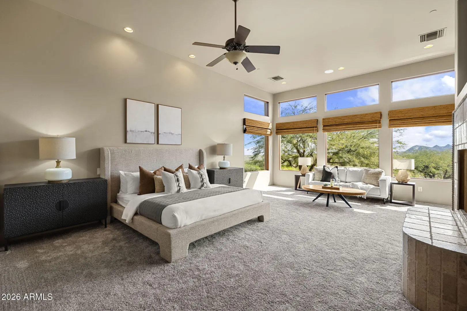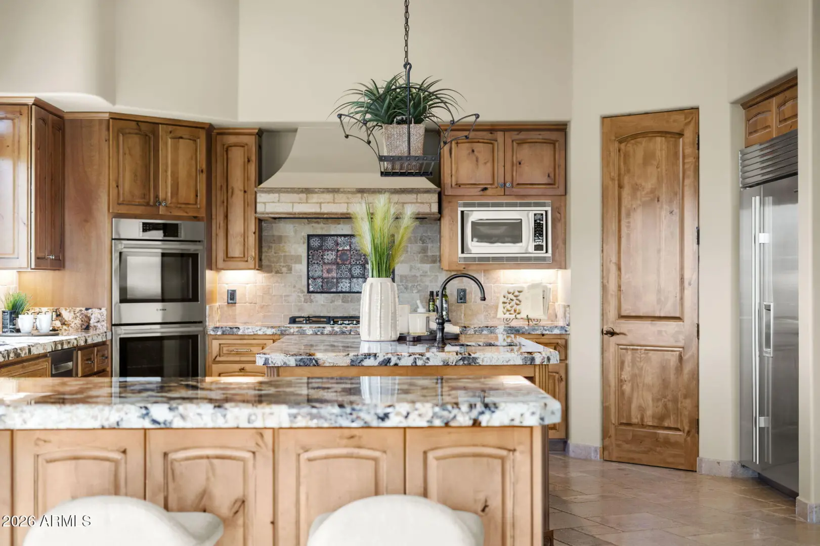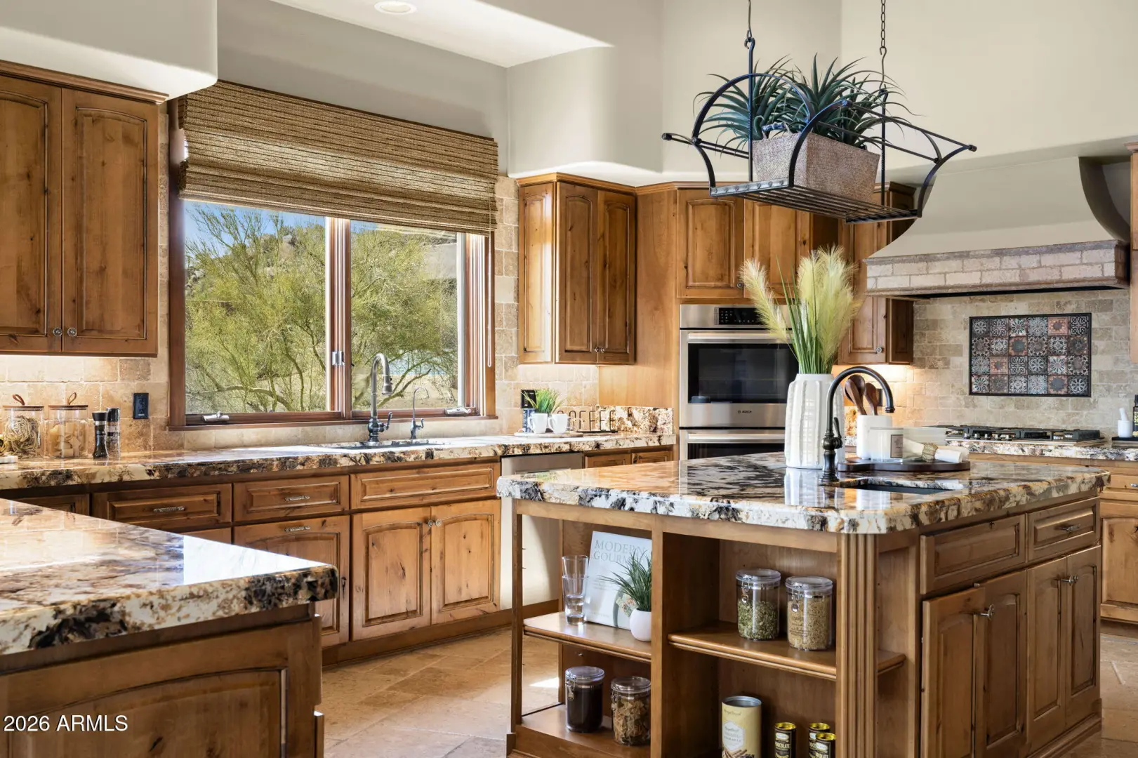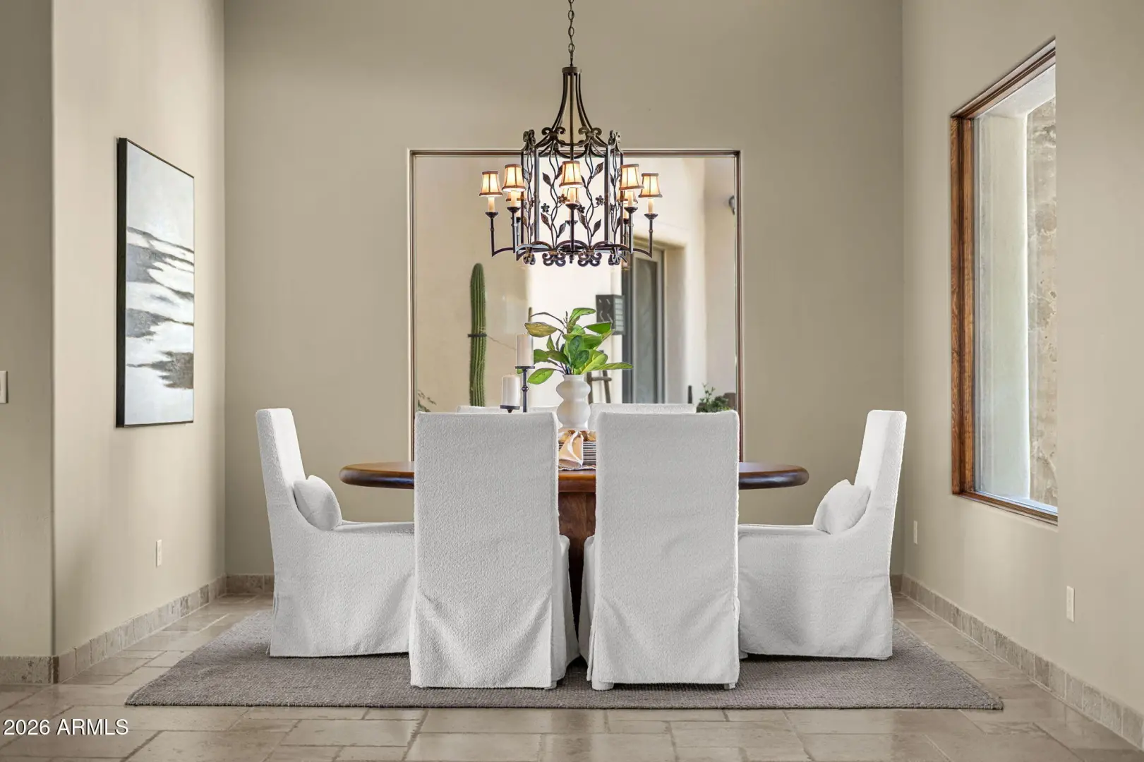 Experience refined desert living in this beautifully designed Troon Village residence, where timeless materials, thoughtful design, and breathtaking mountain views create an exceptional retreat. With no interior steps, the home offers effortless single-level living, rich wood flooring & travertine bring warm elegance throughout. Five stunning gas fireplaces anchor the home's primary gathering spaces, including the living room, family room, primary suite, front courtyard & pool deck, creating inviting moments indoors and out. The chef's kitchen anchors the heart of the home, & is equipped with Bosch stainless steel appliances, a double oven, gas range & built-in refrigerator. The large primary suite opens directly to the upper spa patio for peaceful evenings under the desert sky.
