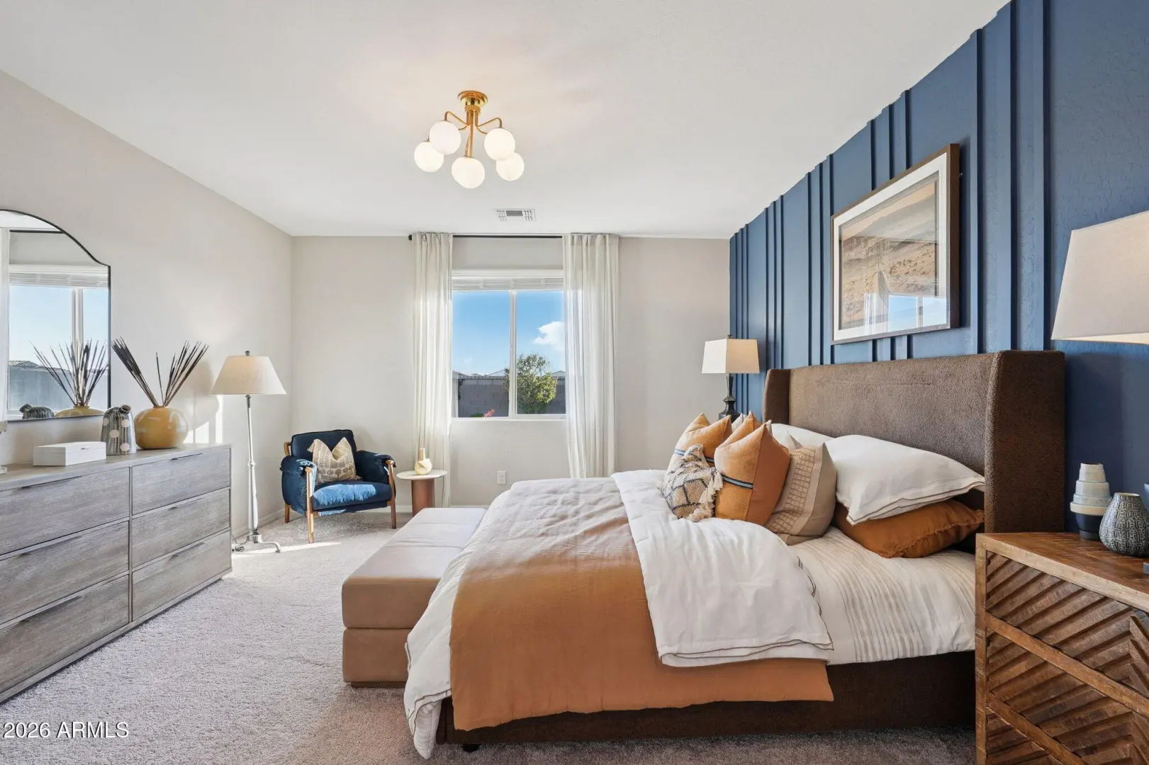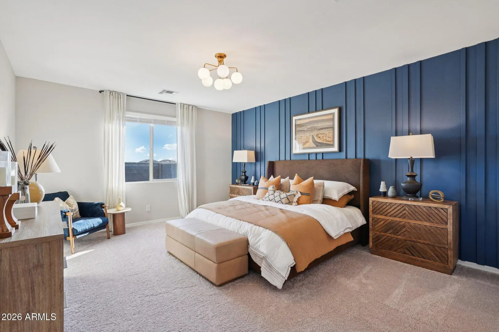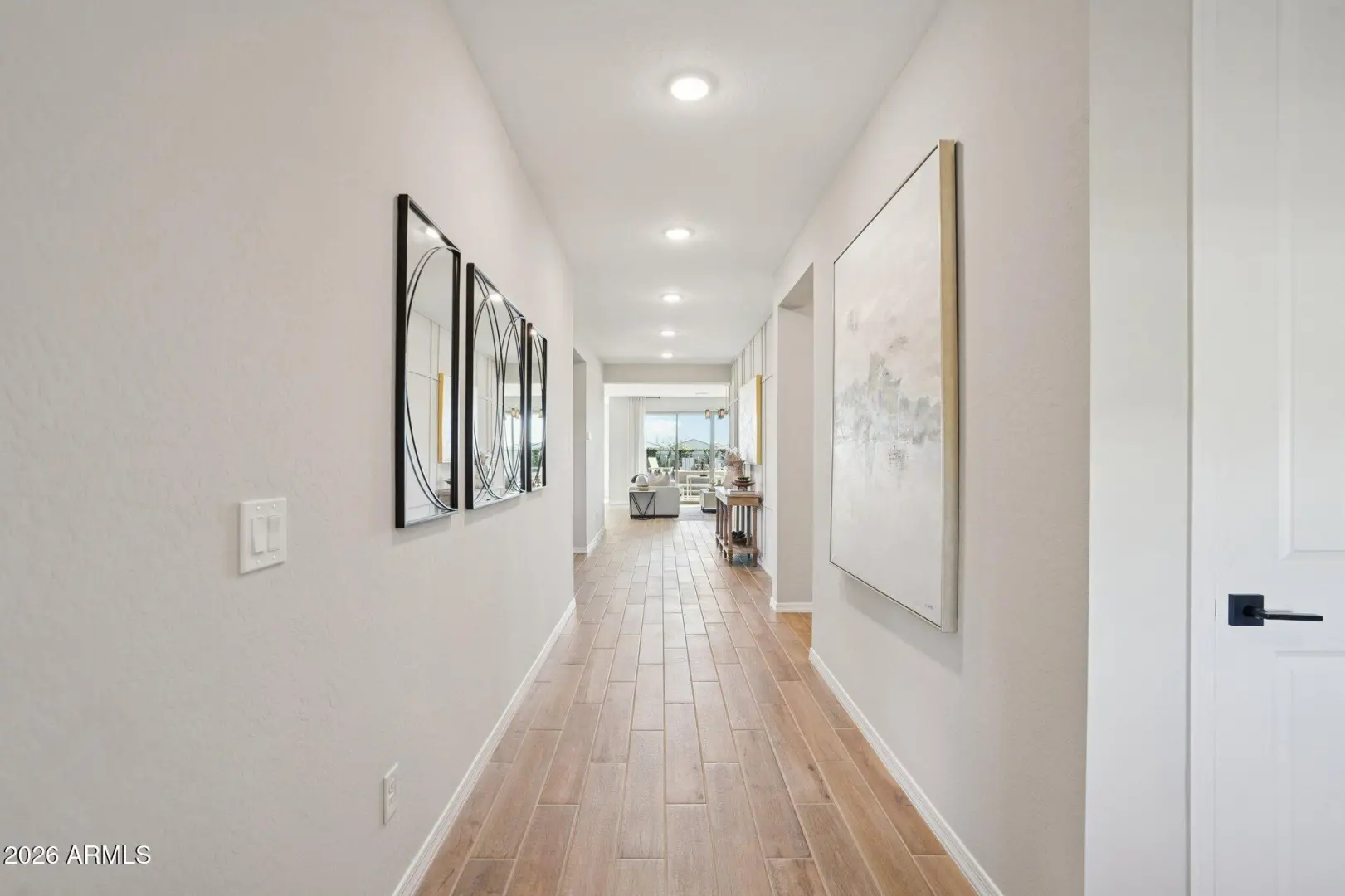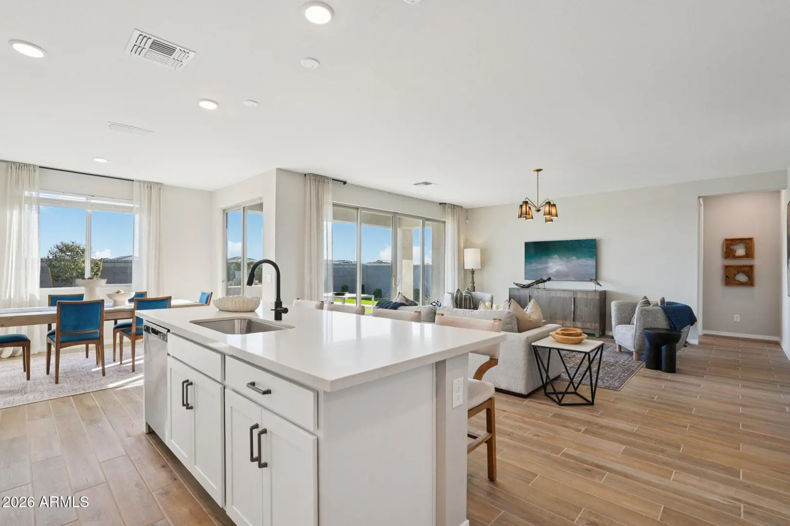 Model Home for Sale! Model furniture available to purchase in addition to list price. Nestled in the heart of San Tan Valley, this 2,485-square-foot Topaz home offers three bedrooms, two and a half bathrooms, a den, and a spacious three-car tandem garage. Upon entry, you are greeted by a wide main hallway and a large foyer with convenient closet space. The open-concept design seamlessly flows into the heart of the home, where you'll find 8-foot doors and a striking 4-panel glass slider. The sliding doors open to a private backyard retreat, offering the perfect space for relaxation. The kitchen, a true centerpiece, features the Harmony Collection, including elegant quartz countertops, modern white cabinetry, a stylish backsplash, and stainless steel appliances. The primary